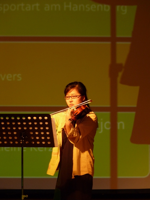 Unter die Haut kamen da eher Sinja & Verstärkung. Man könnte geneigt sein, Sinja und die starken Männer zu sagen, doch bei dieser Hip-Hop Gruppe war kein Mann dabei. Stattdessen war der Chartbreaker wohl eher für die männlichen Zuschauer ein Genuss. Daraufhin stellte Marcel die „neue“ Trendsportart des Hansenbergs vor: das allseits bekannte, praktizierte und beliebte Spiel – nun, nicht mit dem Feuer, aber doch mit gefahrvollen und gesuchten Büchern. Die Frage, ob dies der beliebteste Sport ist, erübrigt sich von selbst, wenn man ab und zu die Bücheranzeigen liest: ständig sucht die Bibliothek irgendwelche Bücher.Ganz brav und klassisch war dagegen Anny, die auf der Geige „Butterfly Lovers“ spielte. Auch wenn die Harmonie klassisch chinesisch war, war es ein Stück zum Entspannen an diesem heiteren Abend. So war möglicherweise auch „Brennt die kleine Kerze“ gedacht, aber als dann noch Silas und Artjom bei den Mädchen mitmischten, bekamen die Schausteller aus unergründlichen Gründen einen stark ansteckenden Lachkrampf, der sich schnell auf die Zuhörer übertrug. Das sich allerdings die Krankheit auch auf die umliegende Technik übertrug, war schon sehr ungewöhnlich. Die Show „Wetten Dass?“ war stark beeinträchtigt – nicht nur die Technik war krank, sondern es hatten auch zwei der weiblichen Replikationen von Thomas Gottschalk eine „Mutation“ erhalten, wie eine Sprecherin (ebenfalls ein Klon) dem verängstigten Publikum mitteilte. Das Wetten verlief entsprechend zum Erfolg der Spieler – die fünf Thomas Gottschalks aus W1/1 müssen nun 4 EG putzen und Jeremy einen HSV-Kuchen backen.