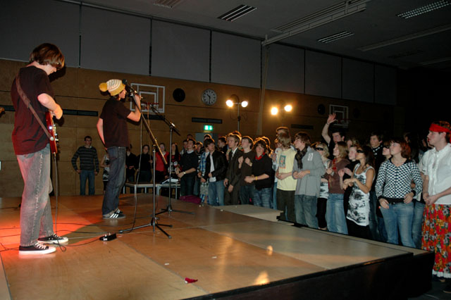 „Guten Abend, meine Damen und Herren, wir begrüßen sie zu einer Sonderausgabe der Tagesschau. Heute sind wir live der Soirée der Internatsschule Schloss Hansenberg zugeschaltet…“. So begann am Abend des 1. 12. 2007 die Moderation (Ines Bertlich und Matthias Faber) der 6. Hansenberg Soiree. Es sollte der Auftakt zu einer der abwechslungsreichsten und stimmungsvollsten Soirées in der Geschichte des Hansenbergs werden. Wunderschöne Gesangsinterpretationen wie „The greatest love of all“ by Whitney Houston, gesungen von Lisa-Marie Ullrich begleitet am Klavier von Saskia Ott machten den Abend zu einem unvergesslichen Erlebnis.Schon Wochen vorher konnte man aus jedem für Proben auch nur ansatzweise verwendbaren Raum laute Stimmen, Gesang, Gitarrenklang, Schlagzeug und anderes hören. Die Hansenberger waren mal wieder am Proben. Und vor allem waren es viele Hansenberger. Das Schöne an der Soirée im Vergleich zu anderen Konzerten des Hansenbergs ist, dass so viele verschiedene und abwechslungsreiche Vorträge aufgeführt werden. Von Musik und Tanz über Theater bis hin zu politischen Reden – dieses Jahr mit Schülersprecher Jan-Eric Filipczak, ist alles dabei. Doch auch der eigentliche Schwerpunkt der Schule wird an so einem Abend nicht vergessen: Mit „Schrödis Flying Circus“ präsentierte die Flugphysik AG sowohl ihr physikalisches Talent in Form von selbstgebauten Flugobjekten, sondern auch das Schauspieltalent ihres Leiters, Herrn Schröder, der als pinker Dracula auftrat. Das Thema Fliegen beschäftigte auch das Orchester: Nach der Titelmusik aus „Die Sendung mit der Maus“, der Filmmusik zu Harry Potter, erhob es sich unter der Leitung von Sebastian Derns rot leuchtenden Laserschwerts (als Taktstock eingesetzt) in die Weiten des Universums, um von dort zum Weihnachtskonzert wieder eine kurze Stippvisite zu machen. Auch zwei weitere Ensembles – wie das „Kwintet pana tadeuzsa“ (das Quintett des Herrn Tadeus“) und eine der Schulbands „Strange Coincidence“ überzeugten nicht nur im Covern von Stücken, sondern auch mit ihrer Kreativität, die in den selbst geschriebenen Songs zum Ausdruck kam. Selbst choreographiert hingegen war die Performance der Tanzgruppe „AHHHHHHHHH!!“, die gemeinsam mit ihrer Leiterin Marianna Pruchnitzkaja „Chop Suey“ von „System of a down“ auf die Bühne brachte.